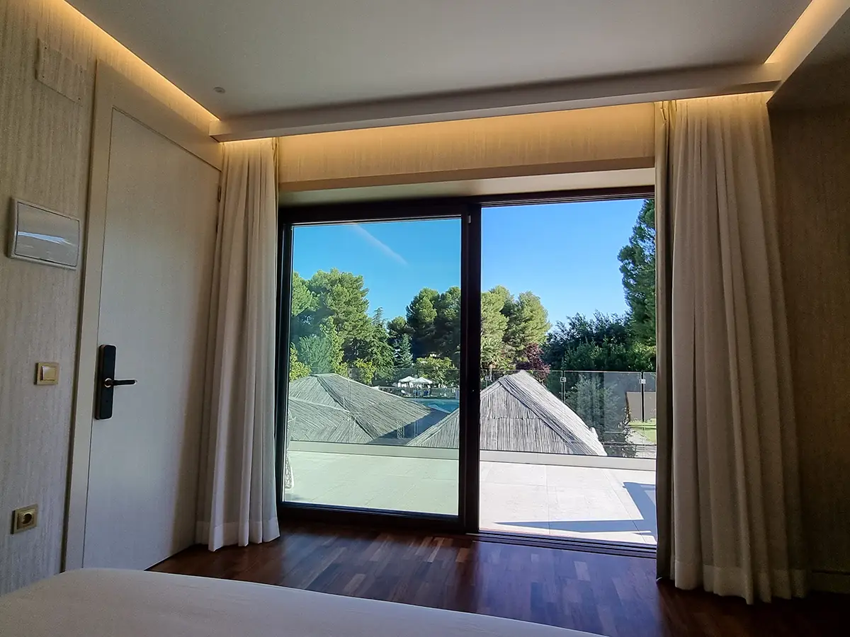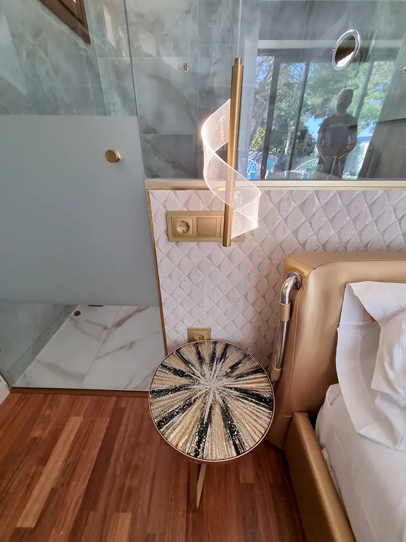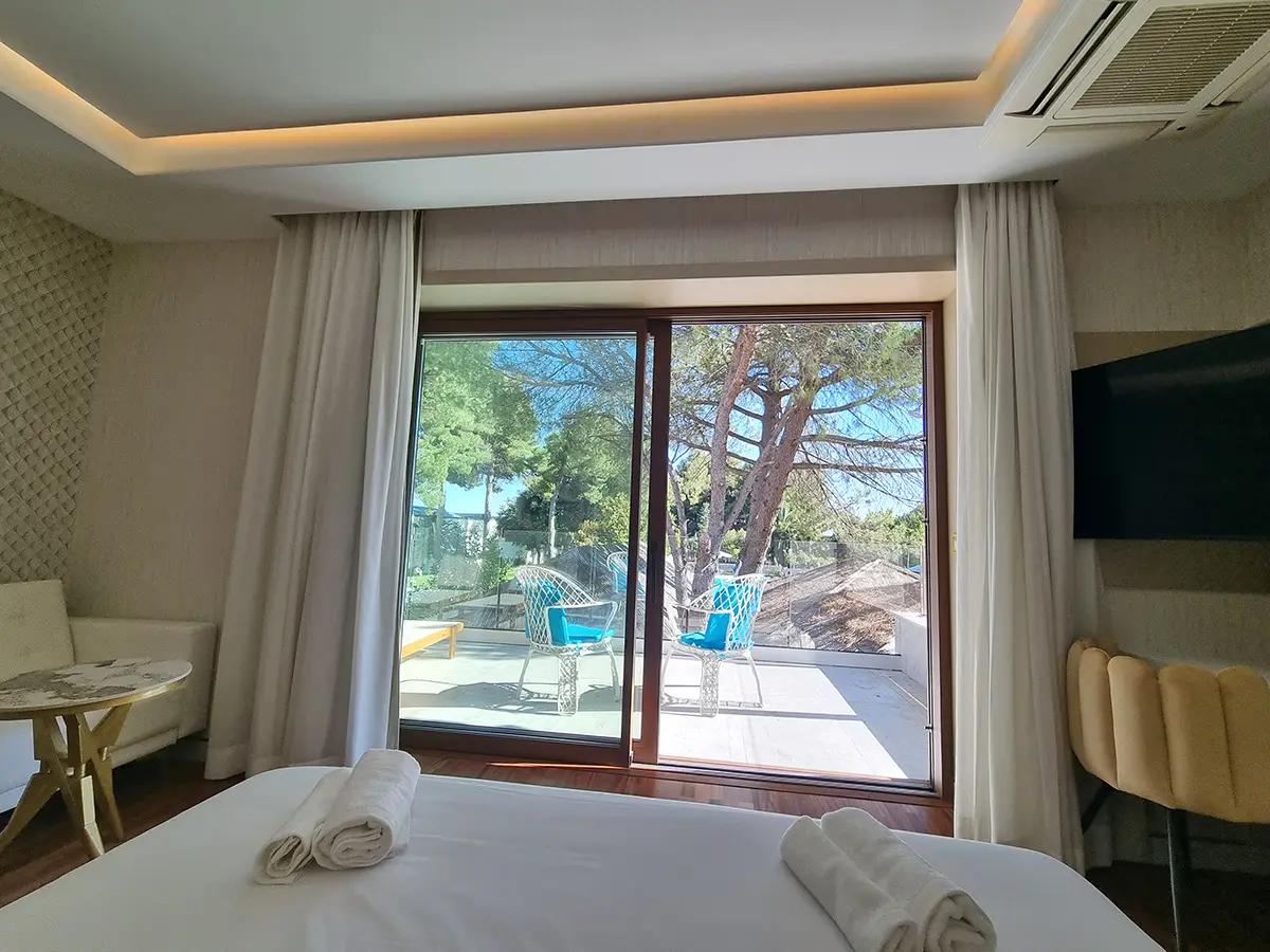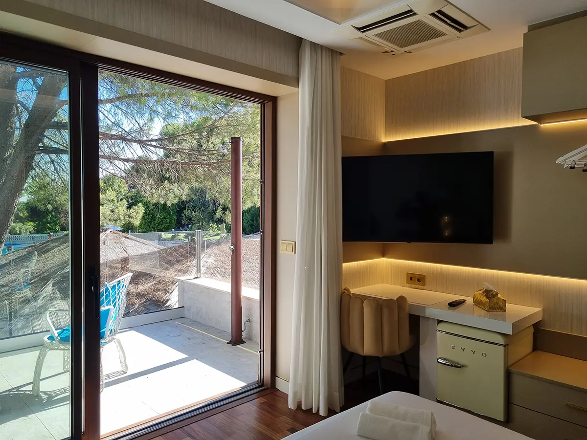 Habitación con vistas a la piscina y jardín situada en la planta baja. Tiene terraza privada de 10 m2. con tumbonas y ducha. Tiene cama de 1,80 x 2,00 m.  Se trata de una confortable habitación con posibilidad de alojamiento para 2 adultos y un niño.  Equipamiento de lujo con diseño en habitación y baño con ducha de lluvia. Dos sillones y equipamiento extra en el baño -ducha efecto lluvia con vistas, mármol, ducha higiénica, etc.-. TV de 50´ con smart tv. Minibar, caja de seguridad, habitación insonorizada, escritorio, armario, etc. Climatización frío-calor.