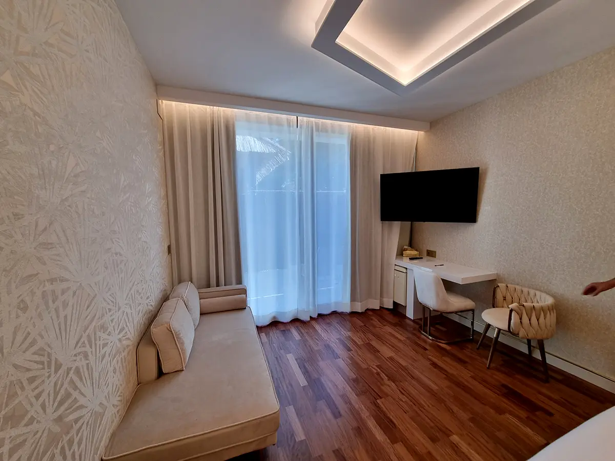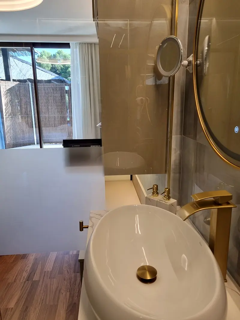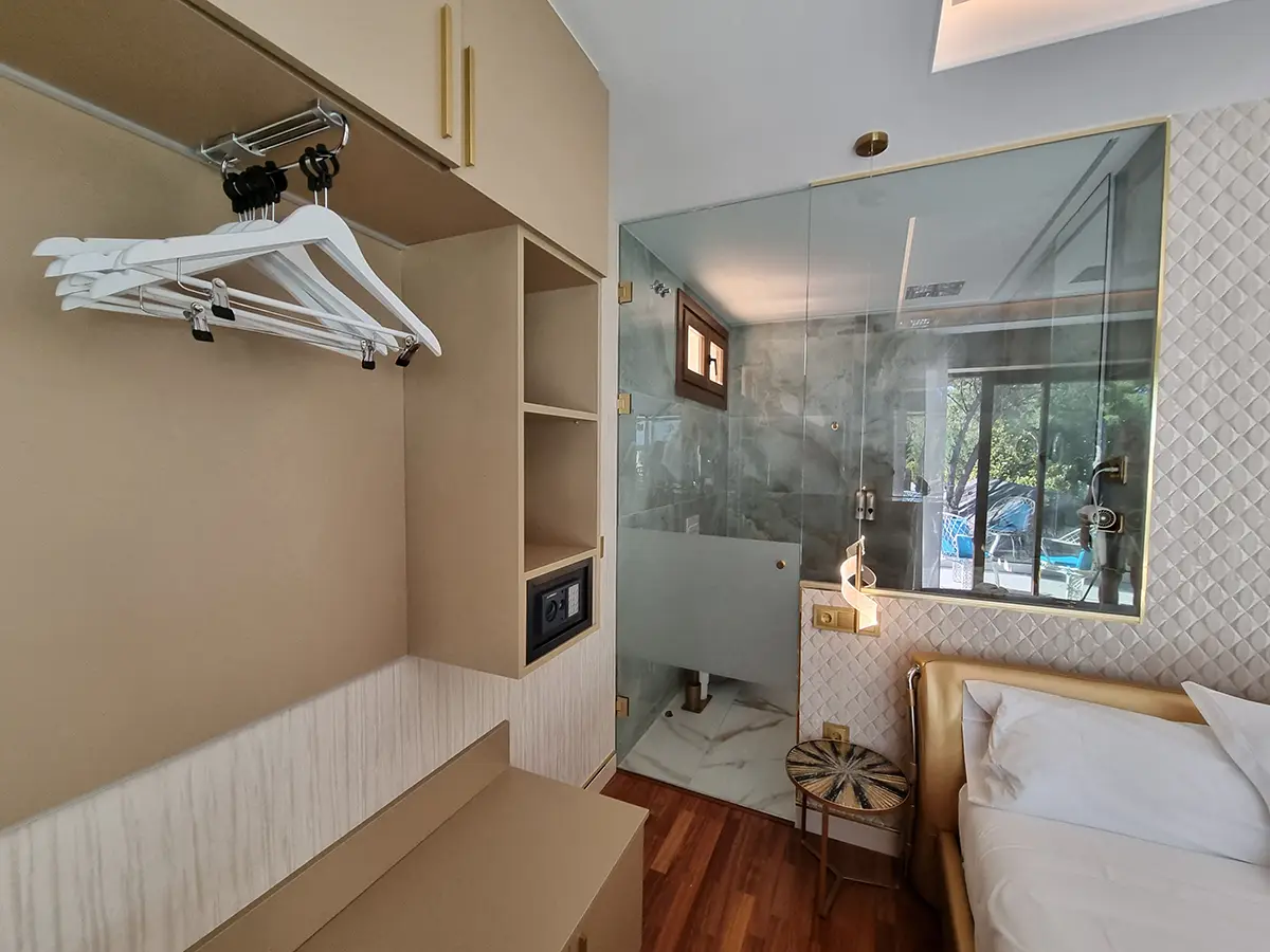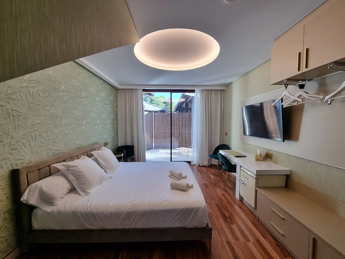 Habitación con vistas a la piscina y jardín situada en la planta baja. Tiene terraza privada de 10 m2. con tumbonas y ducha. Tiene cama de 1,80 x 2,00 m.  Se trata de una confortable habitación con posibilidad de alojamiento para 2 adultos y un niño.  Equipamiento de lujo con diseño en habitación y baño con ducha de lluvia. Dos sillones y equipamiento extra en el baño -ducha efecto lluvia con vistas, mármol, ducha higiénica, etc.-. TV de 50´ con smart tv. Minibar, caja de seguridad, habitación insonorizada, escritorio, armario, etc. Climatización frío-calor.