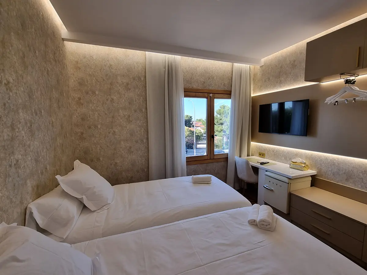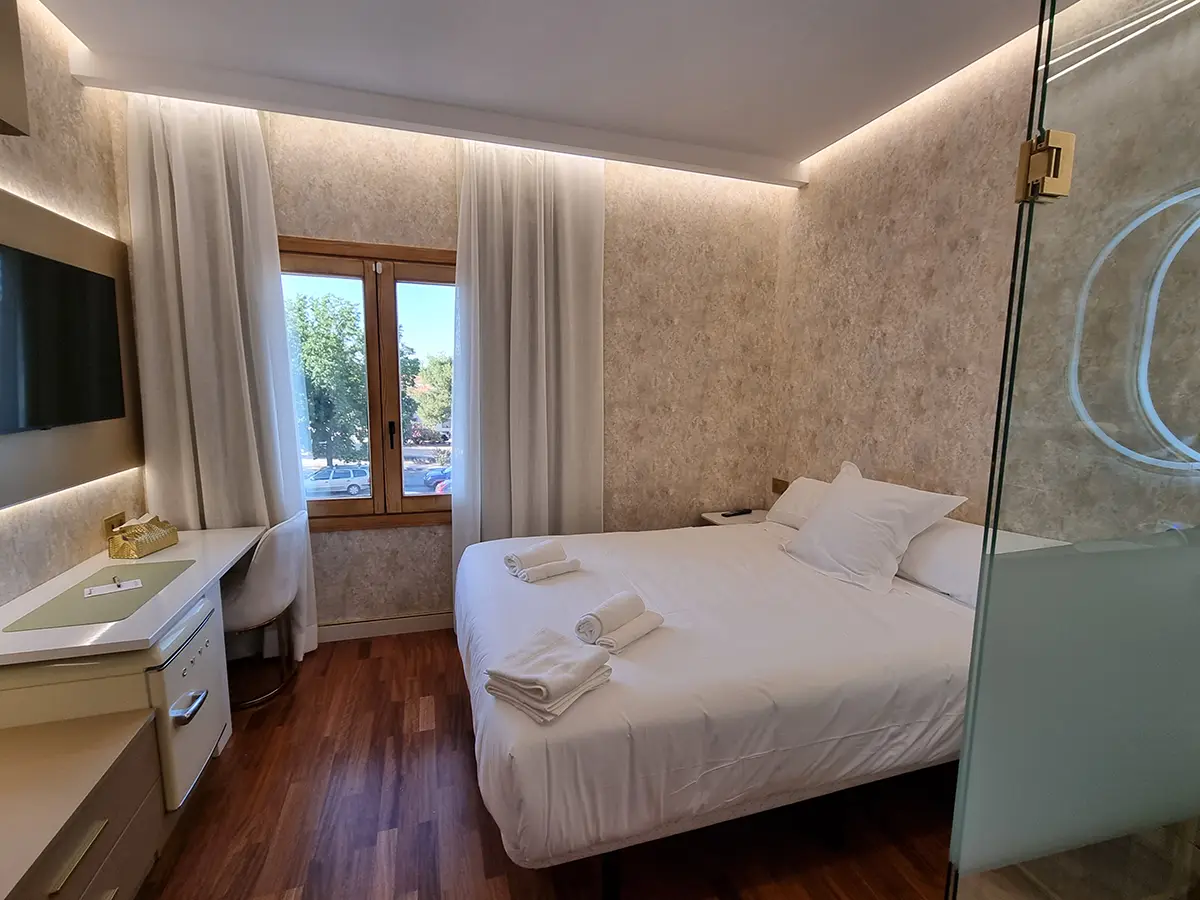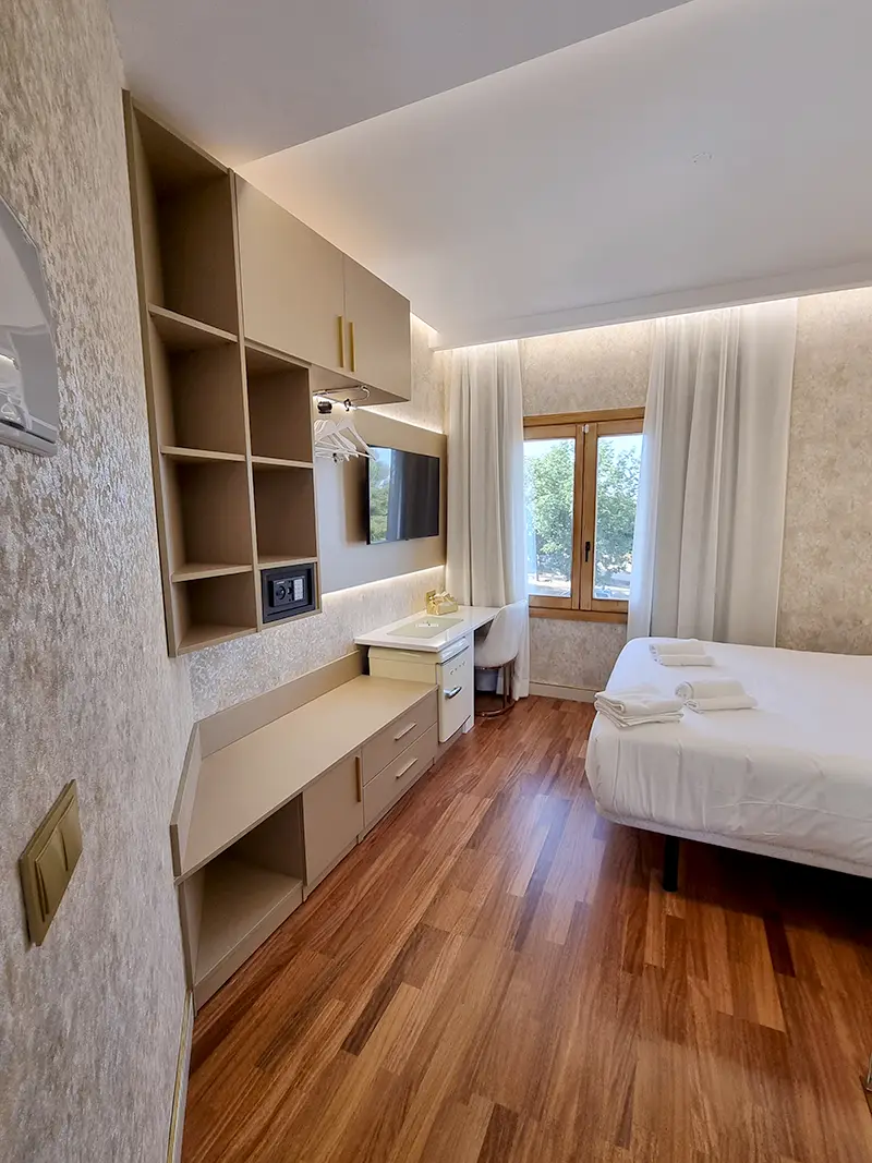 Habitación exterior con vistas a la calle y parking con zona arbolada. Tiene dos camas de 1,05 m. Baño completo. Es una habitación insonorizada, con TV de 40´ con Smart tv. Consta de escritorio, armario, caja de seguridad y servicio de minibar.